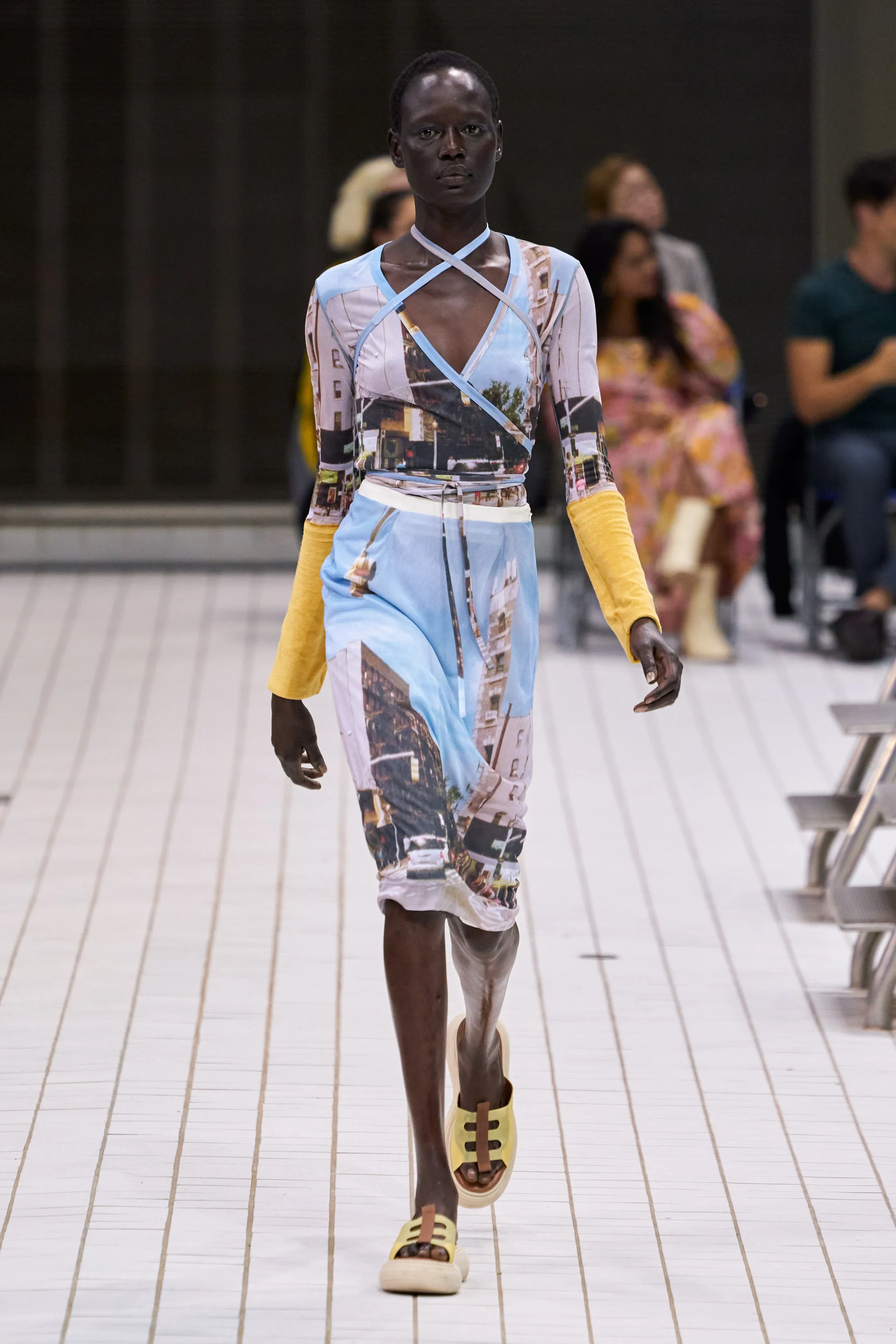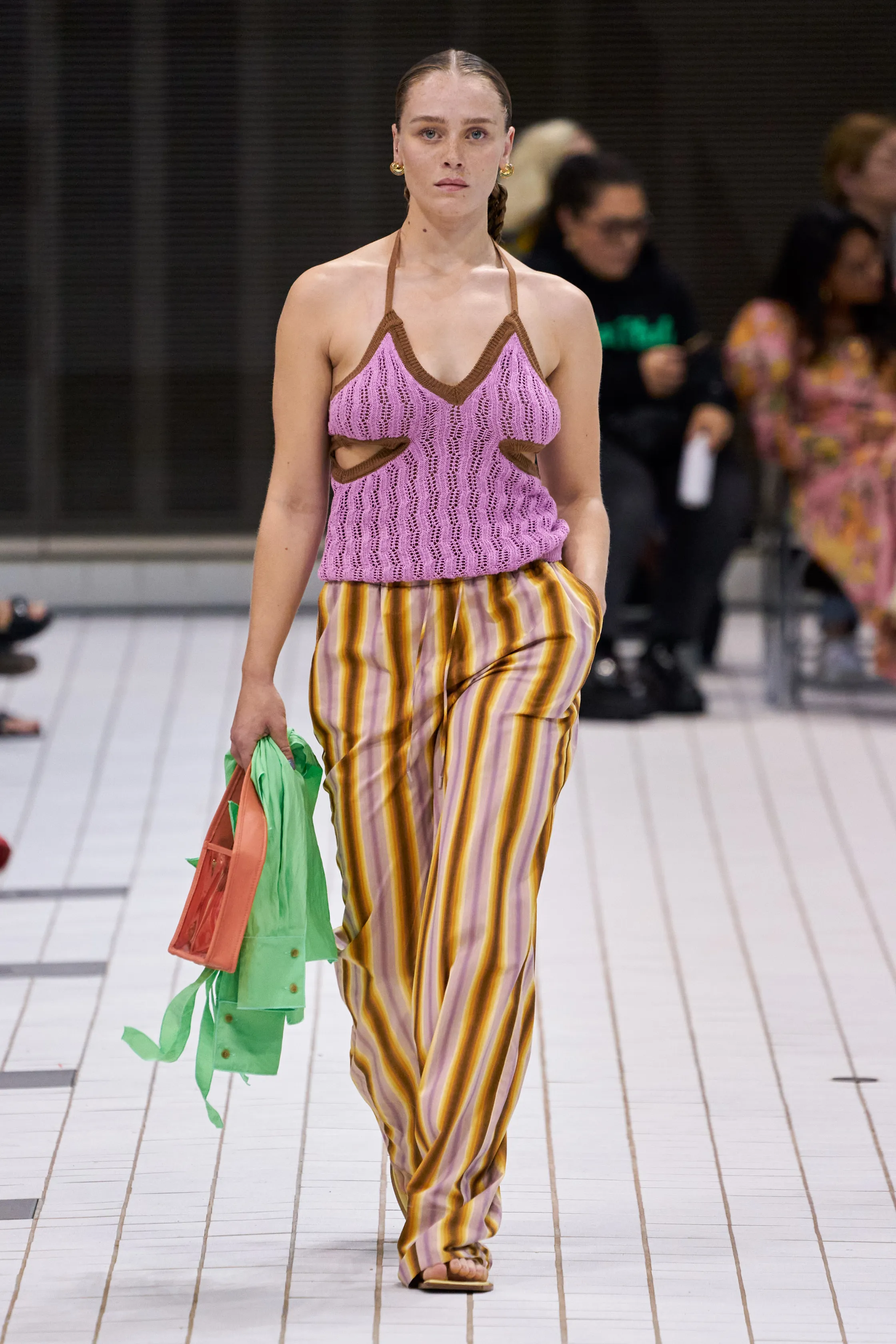 Bright and airy pieces were accompanied by an array of incredible accessories. The straw totes caught my eye, bringing yet another texture that worked wonderfully against the sheer fabrics. Another honourable mention was the mini leather shoulder bags with twisted handles in mint and cream. 90’s inspired shoulder bags came in a variety of styles and colours. Some were solid colours, while others were transparent or printed with photographs. Lastly, the totes with rolled and folded top details elaborated on the casual summer concept.